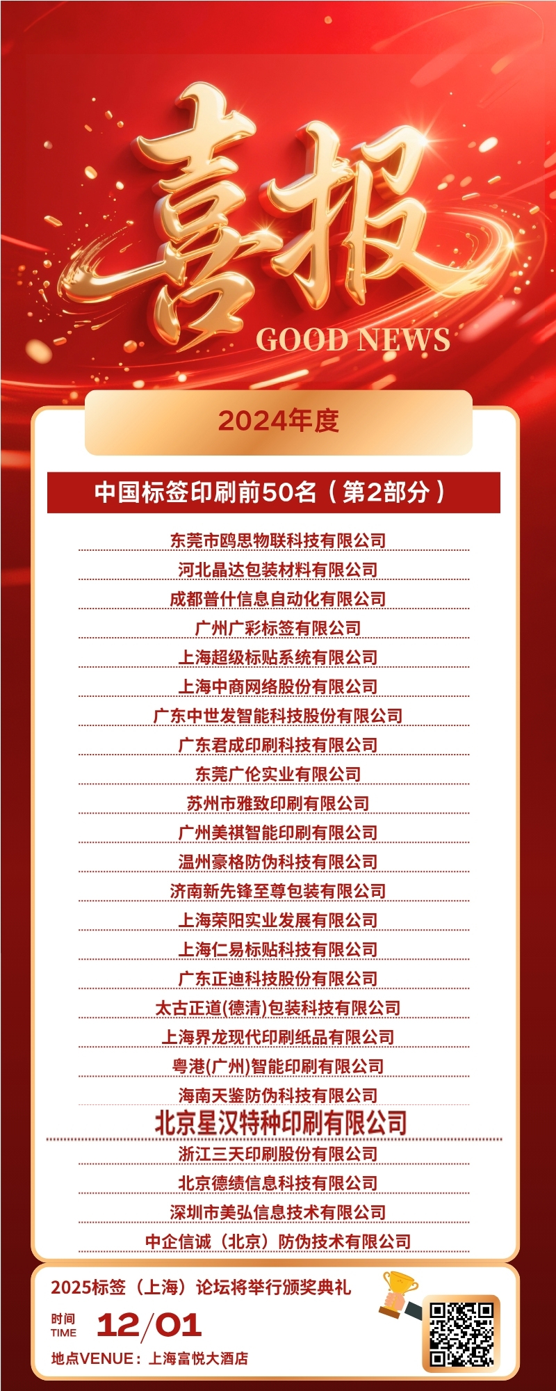 近日,中国包装联合会正式发布2024年度中国包装行业信息统计结果,北京星汉特种印刷有限公司凭借在标签技术领域的突破性创新、全行业场景的深度赋能及品牌影响力,获得“2024年度中国标签印刷前50名企业”荣誉。作为深耕防伪溯源行业26年的企业,星汉特种印刷始终以技术革新重构标签价值,将物理标识与数字科技深度融合,为各行业提供从防伪到数字化运营的全链路解决方案。